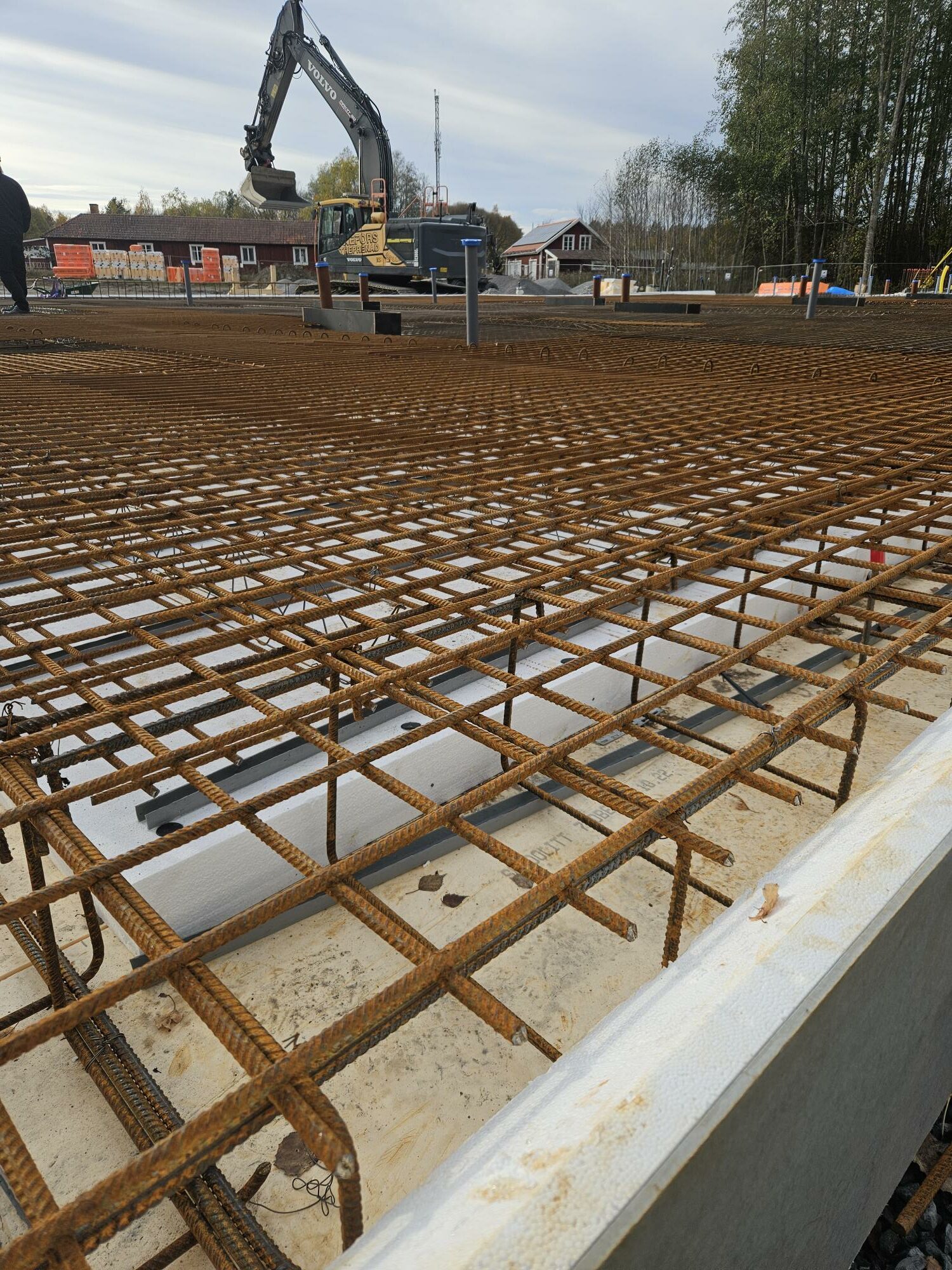 Grundläggning utförs som isolerad kantförstyvad bottenplatta vilandes direkt på mark. Under bärande innerväggar är plattan förstärkt med längsgående voter. Under stålpelare är plattan förstärkt med punktvoter. Höghållfast isolering under kantbalk och vot. Excentricitet från yttervägg hanteras i kantbalk samt i samverkan med lokala förtjockningar i plattan.
